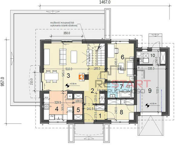 Na parterze znajduje się przestronny salon z dużą i widną kuchnią w aneksie, pokój/gabinet, łazienka, klatka schodowa ze schowkiem pod schodami, wiatrołap, garderoba, kotłownia/pom. gospodarcze i garaż jednostanowiskowy w bryle budynku.